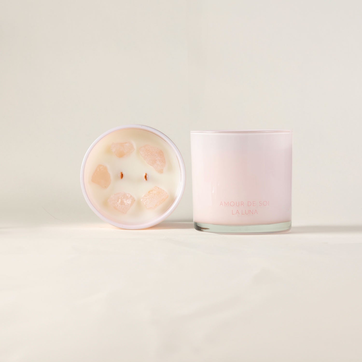 Rose quartz candles with crystals radiate love, compassion, and harmony. Known as the stone of unconditional love, rose quartz is perfect for creating a romantic ambiance or practicing self-care.